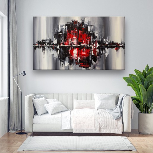 Урбанистички град кој прави рефлесија преставен со црвено црни бои.